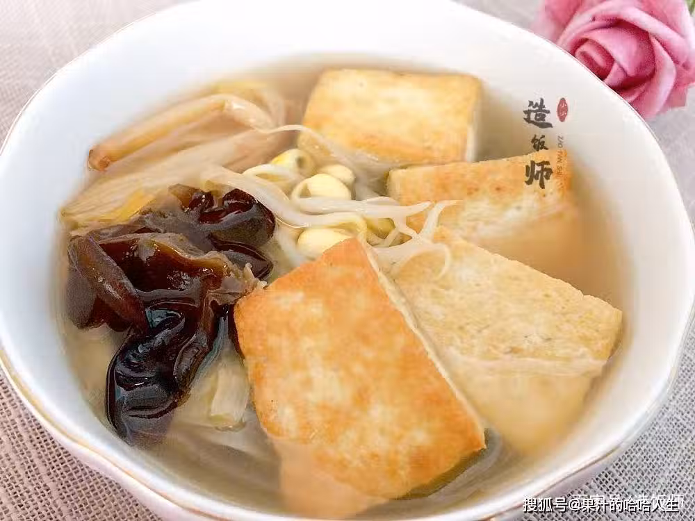 「中山四物湯」中的食材營養非常的全面,其中黃花菜又名金針菜,富含維生素A,有鎮靜安神的效果,黑木耳在《神農本草經》中被譽為「益氣、不飢、輕身、強志」的佳品,具有養血活血的效果,豆腐和黃豆芽都是黃豆的衍生物,高蛋白高纖維,非常利於人體的吸收。