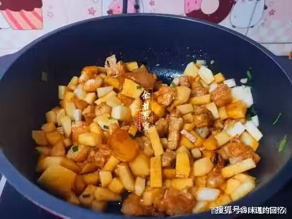 第2步:炒鍋里加入少許的食用油,加入五花肉炒至變色,再加入姜和蔥炒勻,加入蘿蔔、紅燒醬油炒勻;新鮮的五花肉不易出油,可以干煸,或加少許油才可以煸出油膩,煸香後,燜飯也更有味道;