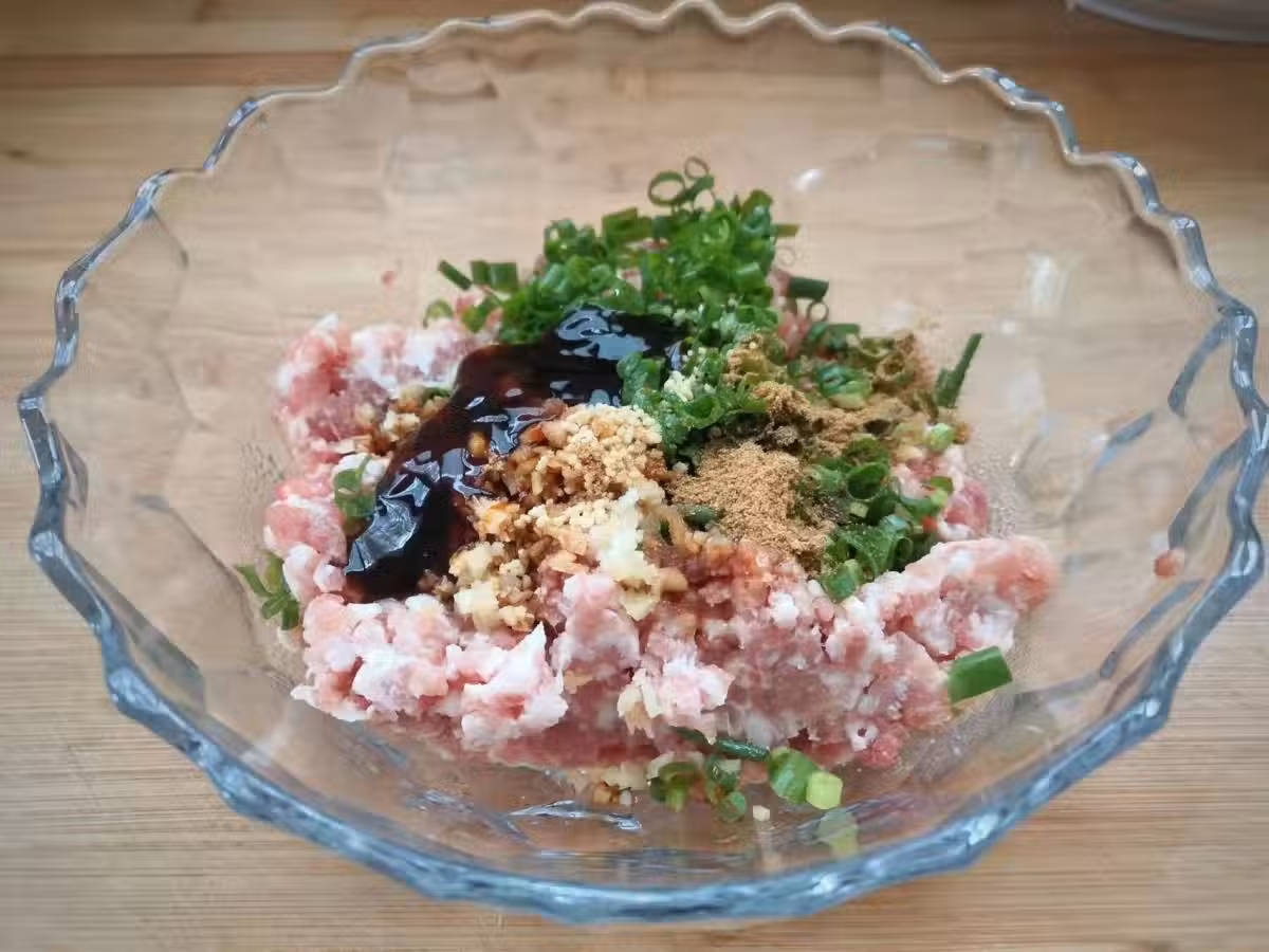 5、再把切好的青椒丁加入到肉餡中,充分用筷子攪拌均勻。