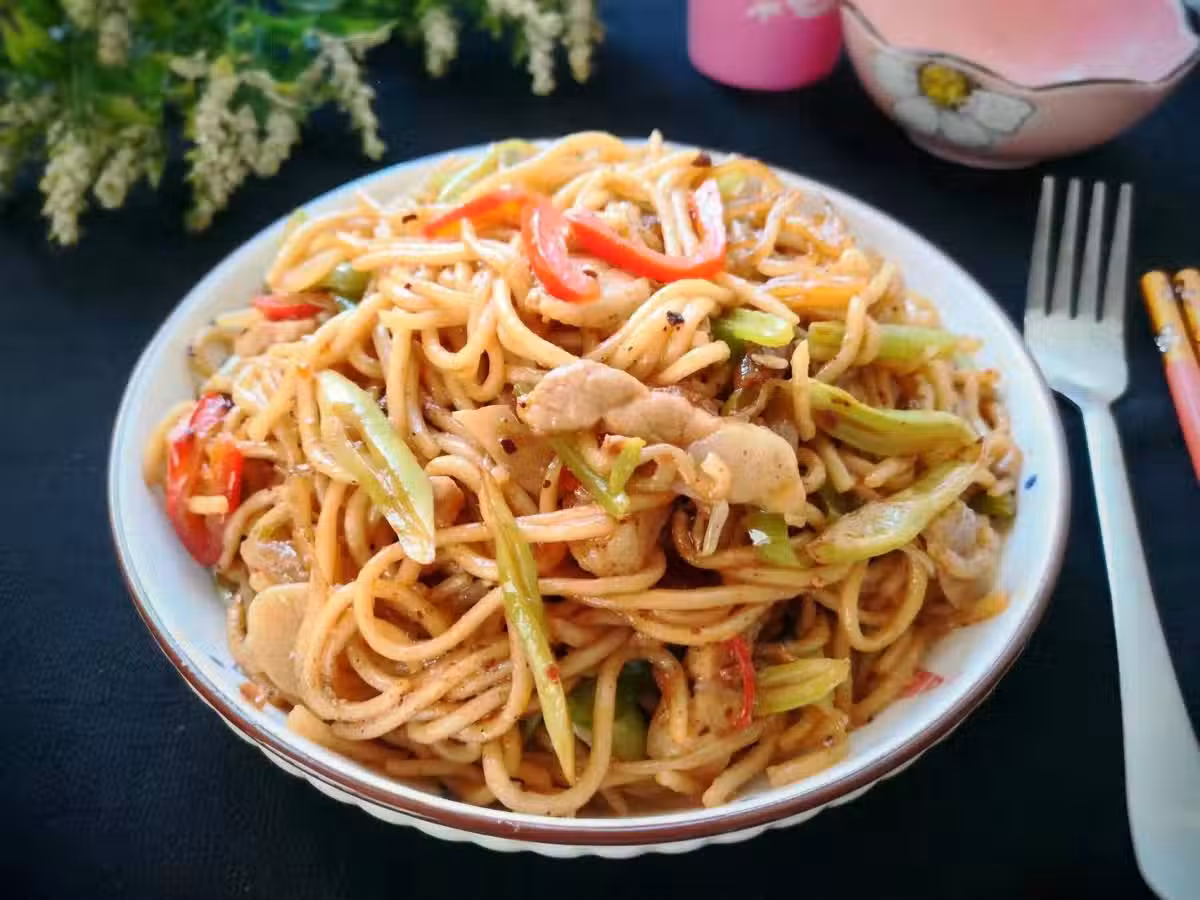 食材:麵條、五花肉、芹菜、豆芽、青紅椒、豆角、洋蔥、大蒜、鹽、生抽、蚝油、老抽、雞精、孜然粉、蔥油。