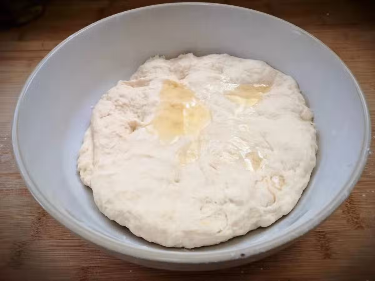 4、20分鐘後拿出麵糰進行第二次揣面幾分鐘,蓋上蓋子繼續放置10分鐘,案板上撒些麵粉防粘,麵糰整理成長寬形。