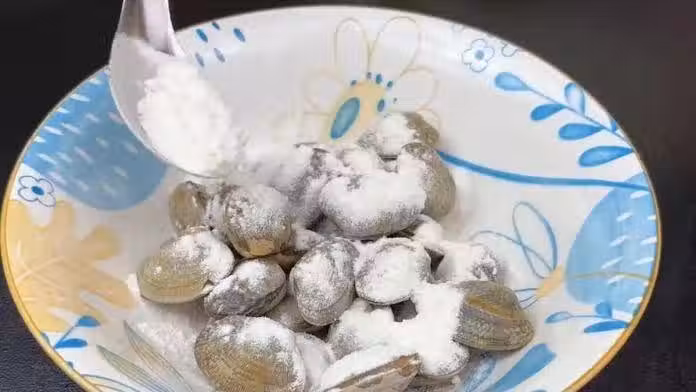 妙招二,麵粉法。將花蛤放入碗中,往裡邊加入少量的麵粉,再加入40度的溫水,花蛤最怕的就是溫水,然後再下手將麵粉攪拌溶解,浸泡十分鐘。