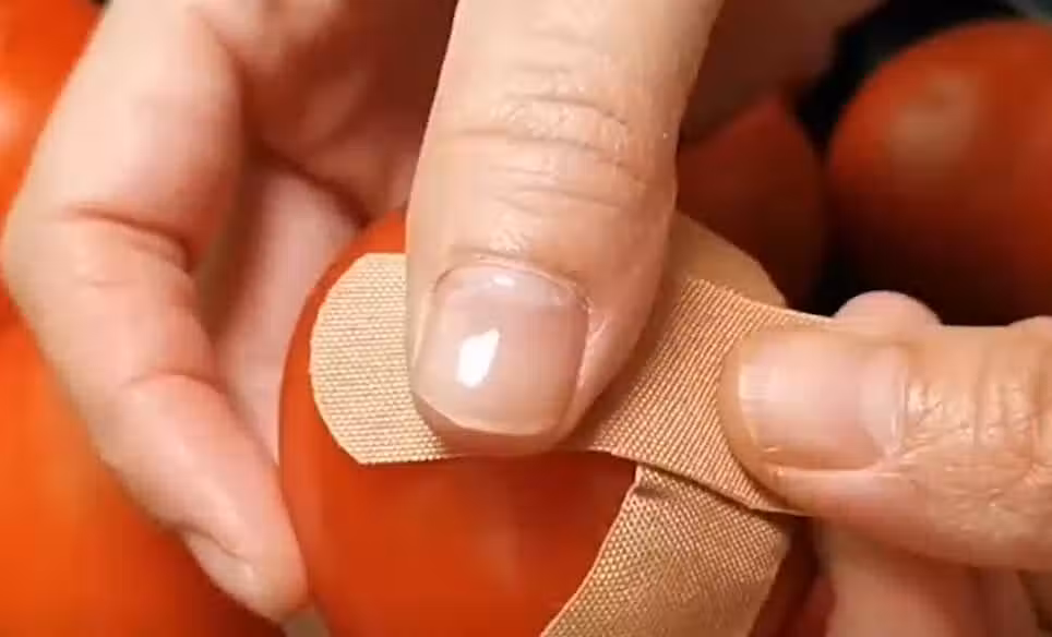接下來咱們再拿出一塊創可貼,直接貼在我們剛才撕掉葉片的這個蒂部的位置就可以了,因為這個西紅柿蒂部是成熟最快的地方,如果說我們用創可貼把它貼住之後,它的成熟的速度就會變慢。