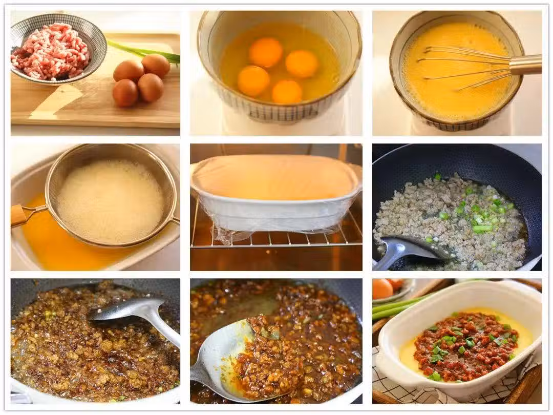 第九步:等雞蛋蒸好後,把炒好的肉末澆在上面就可以上桌了。