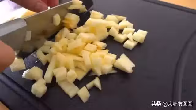 然後把蘋果給炒一下,鍋里加黃油化開,倒入蘋果翻炒變軟,加白糖炒均勻出鍋備用。