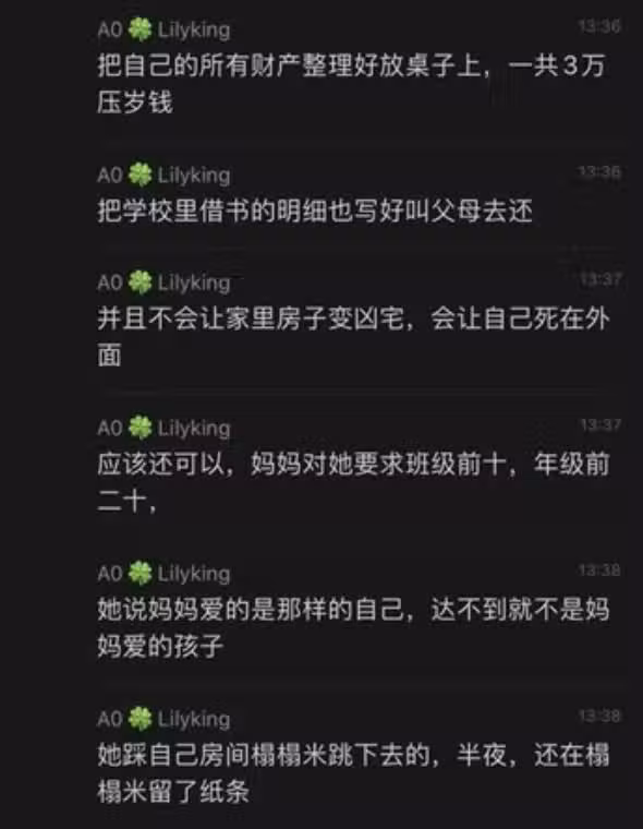 無法再承受父母嚴厲的愛的小女孩,離開前也特別留下3封遺書,並親手在信件中表示常常被爸媽要求保持好成績,若事後沒有達到爸媽得期許,爸爸媽媽從來沒有過安慰鼓勵、一同想辦法解決問題,反而只會換來嚴厲的怒罵和毆打,像是巴掌、手指、手臂、大腿及背部等都是常常被毆打的部位。