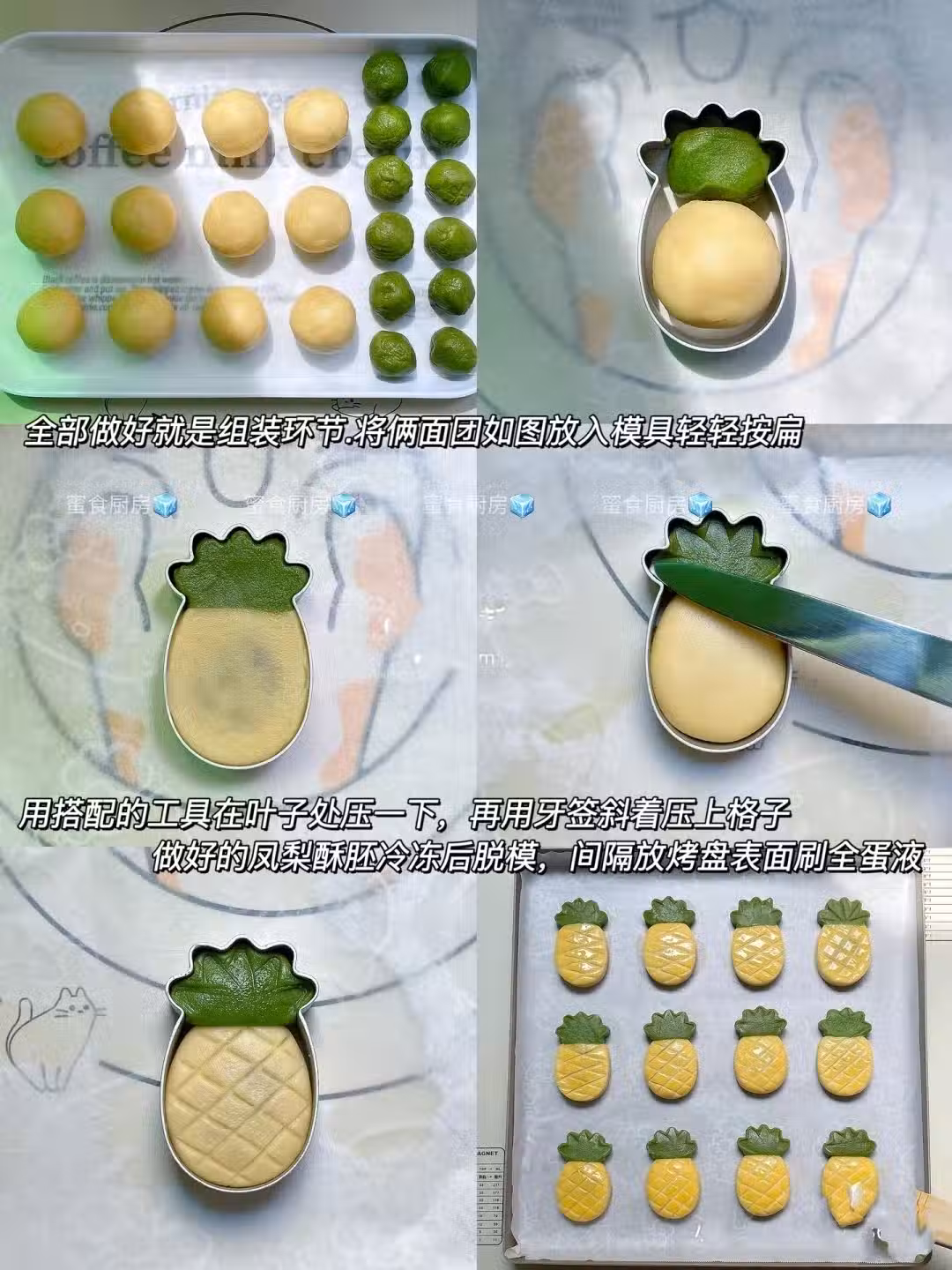 4)用小工具在葉子邊角輕壓修飾一下,鳳梨部分用牙籤左右斜著壓直線,交叉出格子紋理.做好 放冷凍定型脫模,間隔放入烤盤在表面刷上薄薄 一層全蛋液,也可以帶模具一起烤立體效果更 好,在綠色部分用錫紙覆蓋防止變色