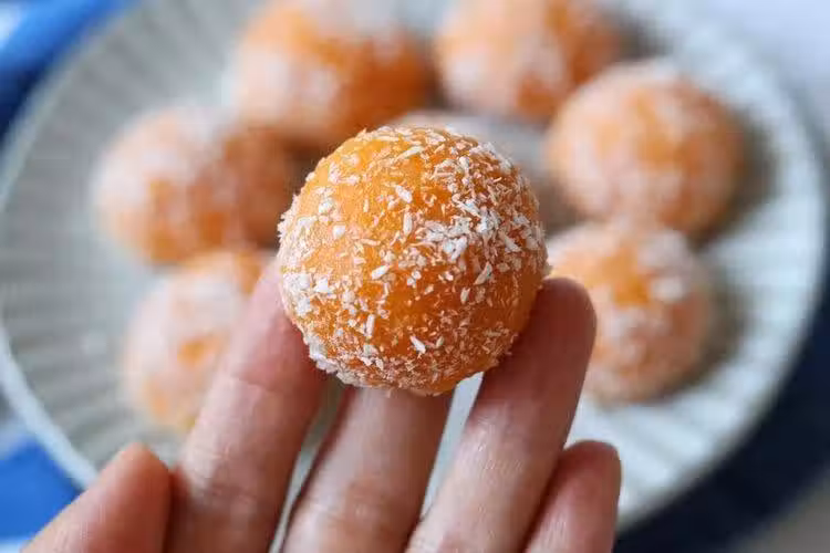配料:紅薯泥120克,奶粉20克,糯米粉60克,椰蓉15克