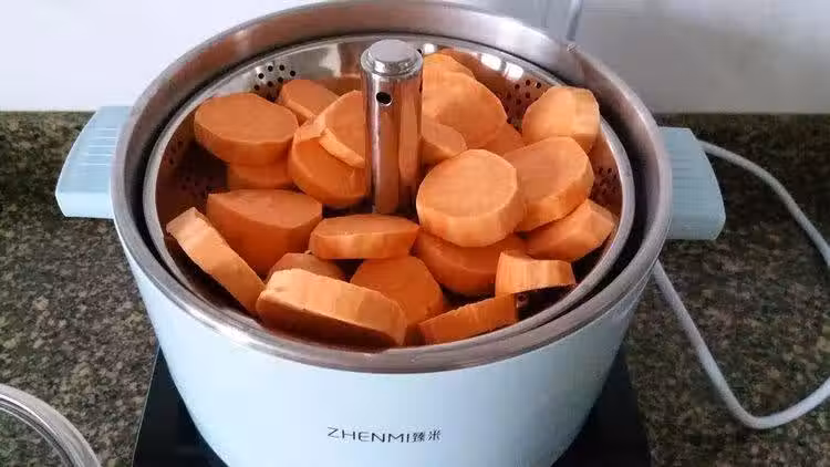 3、在蒸紅薯的時候將其他食材都準備好,另外拿一個乾淨的容器,裡面是無水無油的,將蒸熟的紅薯塊放進去,要趁熱將紅薯搗成糊狀,然後再倒入適量的奶粉。