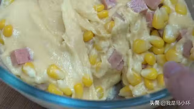 7、接著把玉米粒跟切成粒的午餐肉加進來再攪拌均勻。注意不要過度攪拌。