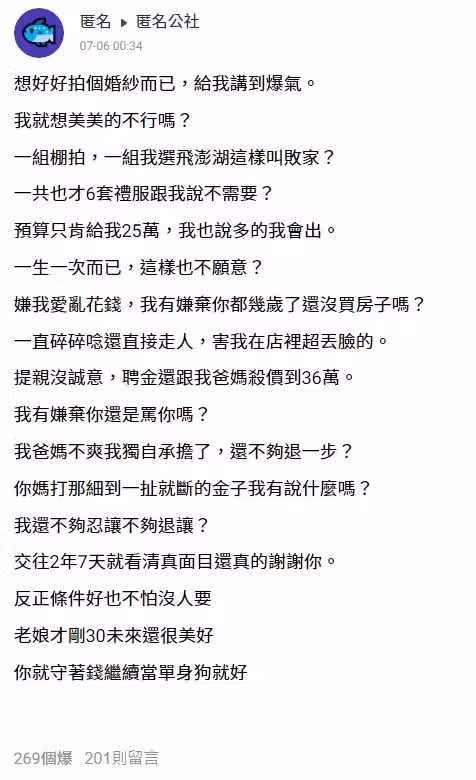 想好好拍個婚紗,給我講到爆氣!一組棚拍、一組飛澎湖,這樣叫敗家?一共6套禮服,預算只給我25萬,我說多的我出,未婚夫卻嫌我亂花錢,交往兩年短短七天看清了他的真面目... #網友全不挺