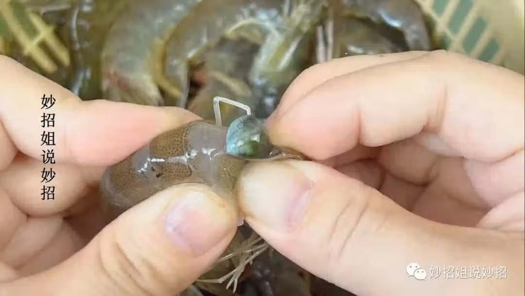 接著我們用手慢慢地將蝦包拽出來。蝦包拽出來後可以發現,背上的蝦線也連接著蝦包一起被拽了出來,非常的簡單,這樣一隻大蝦就處理好了。