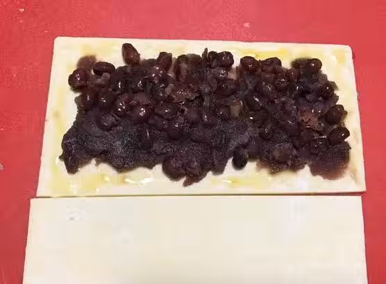 3、 紅豆餡放上去之後蓋上另一張千層酥皮,上下對齊。用勺子沿著周圍按壓,壓實一點。