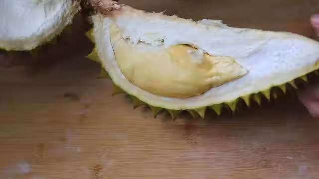 【第三步】:將壓成泥的榴槤肉放入準備好的蛋撻皮中,依次將蛋撻皮對摺,手指按壓邊緣。