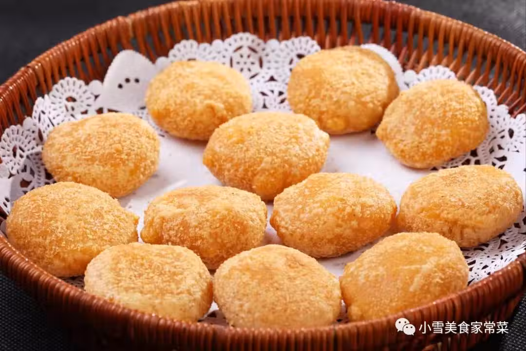 3.將麵糰取出,切成小劑子,整理成小圓餅。鍋內加油燒至六七成熱,放入南瓜餅,小火炸,炸至南瓜餅金黃,漂起後,撈出控油。