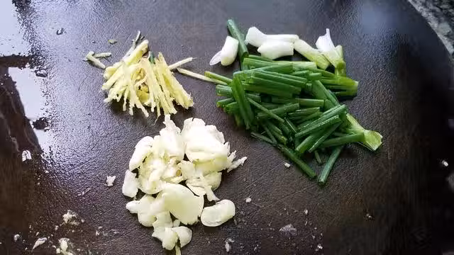 4.起鍋熱油,把生薑、大蒜跟蔥白放下去炒香,然後把豆腐倒進去翻炒均勻,最後放一點點鹽、2勺生抽、一勺蚝油,繼續翻炒均勻後,倒入一大碗清水。