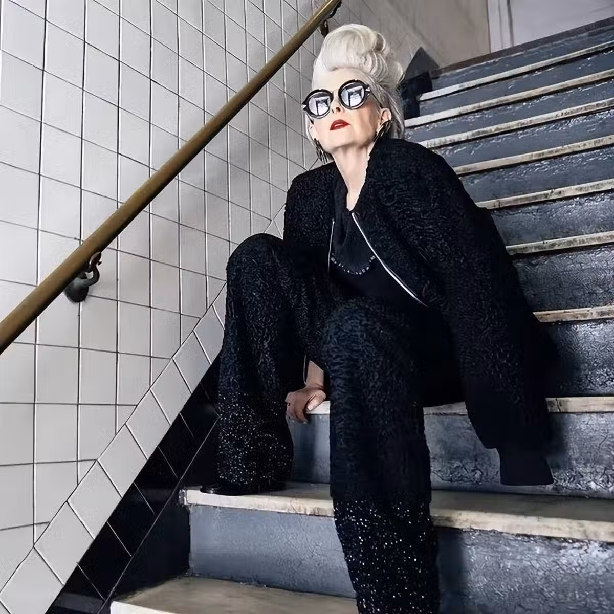 Lyn Slater博主的一頭白發是她標志性的特點,她喜歡把弄自己的一頭秀發,雖然已經全白,但是她很喜歡自己的這個狀態,真實、美麗、有故事,那是歲月的沉澱和生命的內涵。