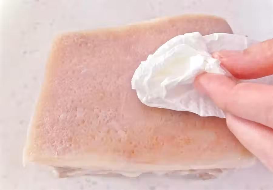 5、五花肉炸好以後,先放入水中浸泡,將肉皮表面浸泡出虎皮狀,接著再切成薄厚適中的肉片。