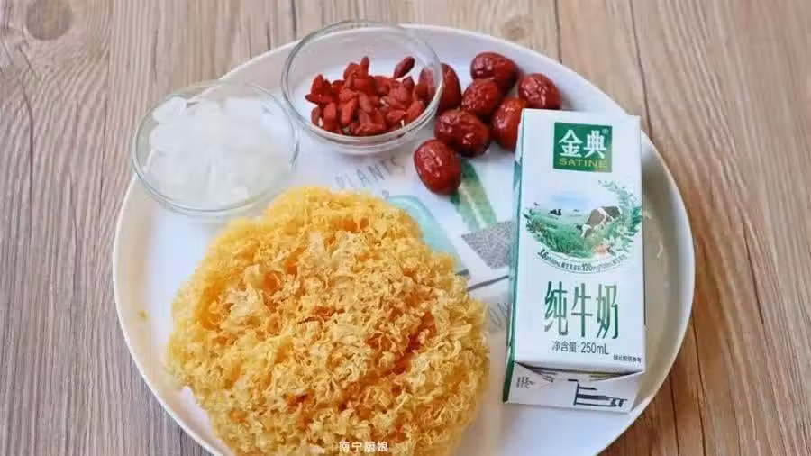 準備食材:牛奶1盒,銀耳1朵,枸杞、紅棗適量。