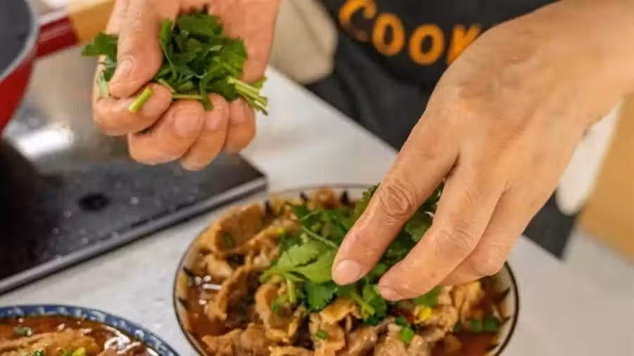 第九步:重新拿一口乾凈的鍋,往裡面倒入少量的油,將油燒熱,然後把油淋在蔥花和香菜上,激發出香味。