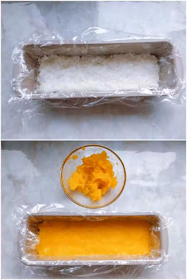 8. 把蒸熟的南瓜肉用勺子碾成南瓜泥,將南瓜泥和糯米飯交替鋪在裡面壓平整。