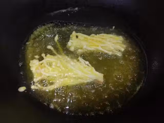 步驟五:油溫再次燒熱,8成熱時,倒入金針菇復炸10秒鐘,瀝干油後分出鍋,再用廚房紙巾吸掉多餘的油分。