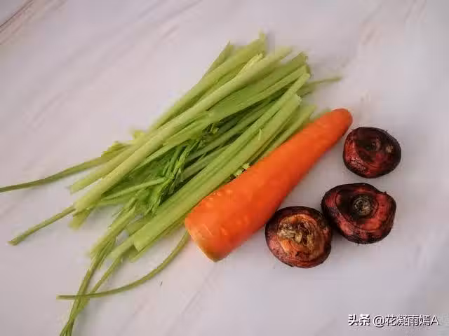第一步:芹菜我們最好用香芹,因為香芹味道濃一些而且也細,切的時候好切,把芹菜葉擇去,胡蘿蔔洗乾淨,荸薺洗乾淨去皮。