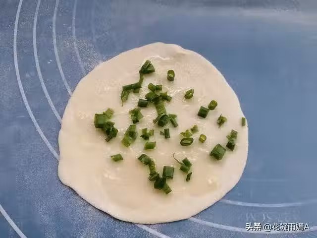 第四步:取一個擀好的餃子皮,撒上點鹽,鹽的話不用每層都放,隔兩層放一點就行,不然沒有鹹味吃起來會膩,然後在塗抹上油酥撒上香蔥碎,油酥也是隔兩層塗抹一次,其他直接刷油就行,要是嫌麻煩,可以全部刷油。