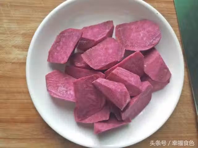 2、將裝好的紫薯連同盤子一起上鍋蒸至紫薯軟爛,也可以用蒸鍋,我是電飯鍋煮飯時隨便整的,放入盤子是防止米飯變成紫薯的顏色。