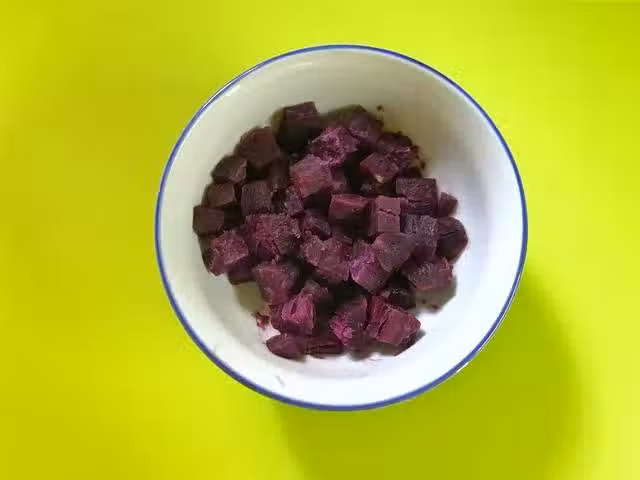 7、把過涼的西米放入牛奶中,再把另外的一份紫薯塊一起放入拌均後加適量蜂蜜即可。