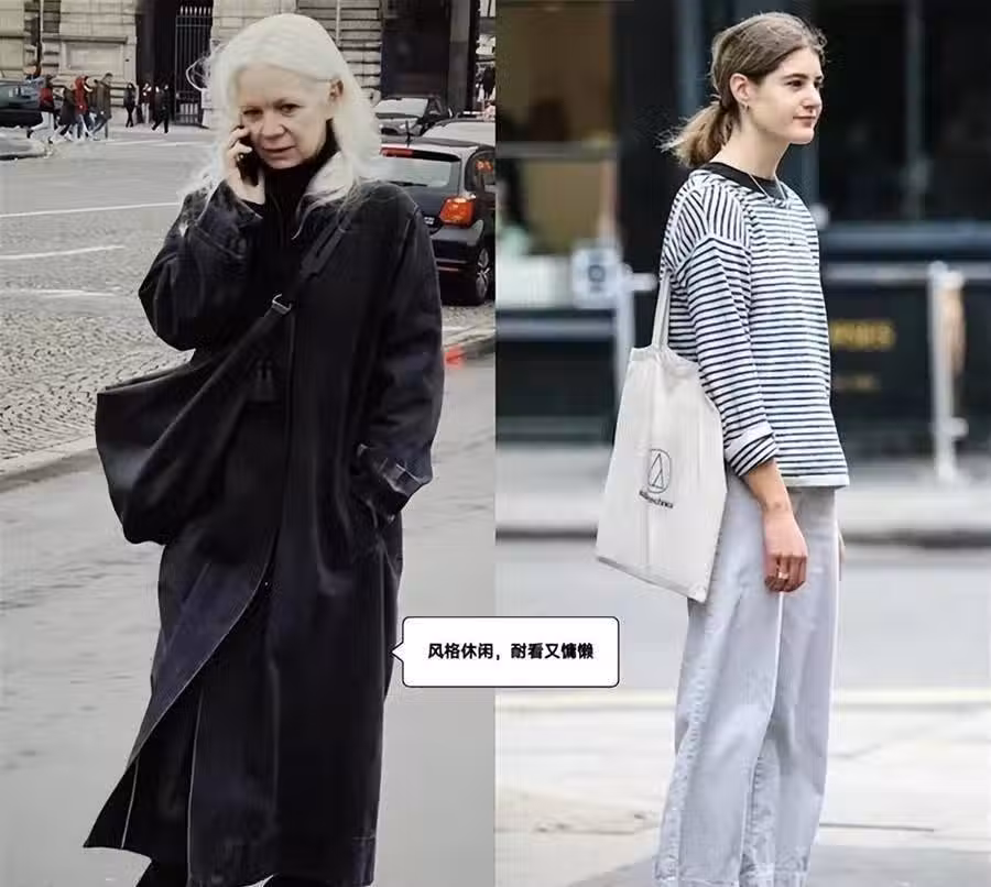 當帆布包融入法國女人簡單舒適的服裝中,深色帆布包配大衣慵懶帥氣,白色帆布包配條紋衫少年感十足,在法國,帆布包就是慵懶感的標配!