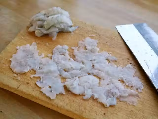 3.將22個半隻蝦仁和蝦蓉放在盤裡加鹽、糖、白鬍椒粉、米酒15克、蔥薑汁和澱粉分開調拌均勻。
