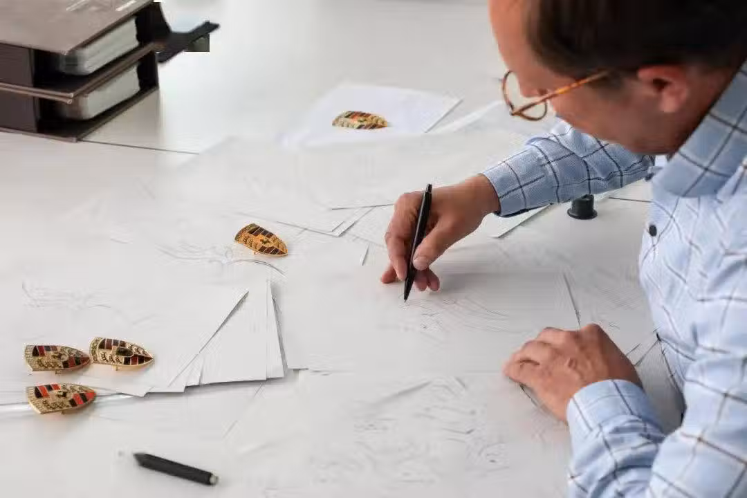 盾徽中央,圍繞在駿馬周圍的盾牌採用了全新比例,其輪廓由一個精細打磨後的凹槽構成。 「STUTTGART」字樣採用了保時捷字體,增加其可讀性。