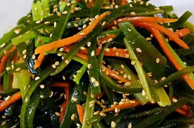 燒一鍋熱水,將泡發好的海帶絲焯水去腥,撈出過冷水,瀝干水分。