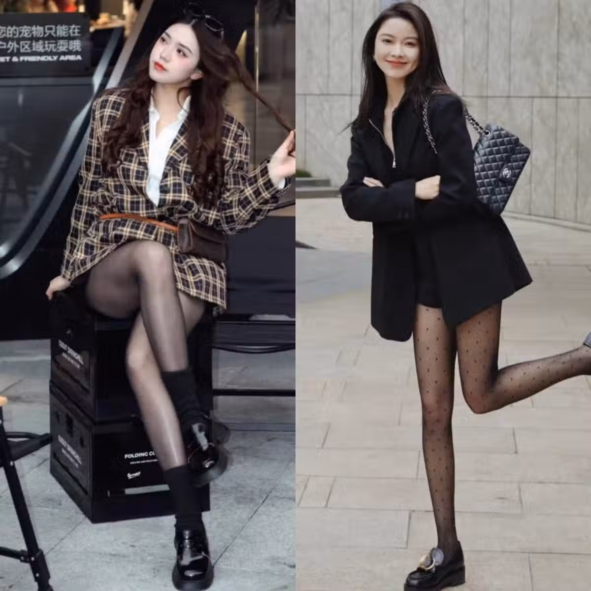 如果喜歡低調一些的穿法,那就可以嘗試帶有「透肉效果」的純黑色絲襪;但若是想要打造出更加浪漫復古的風格,則可以選擇波點絲襪。