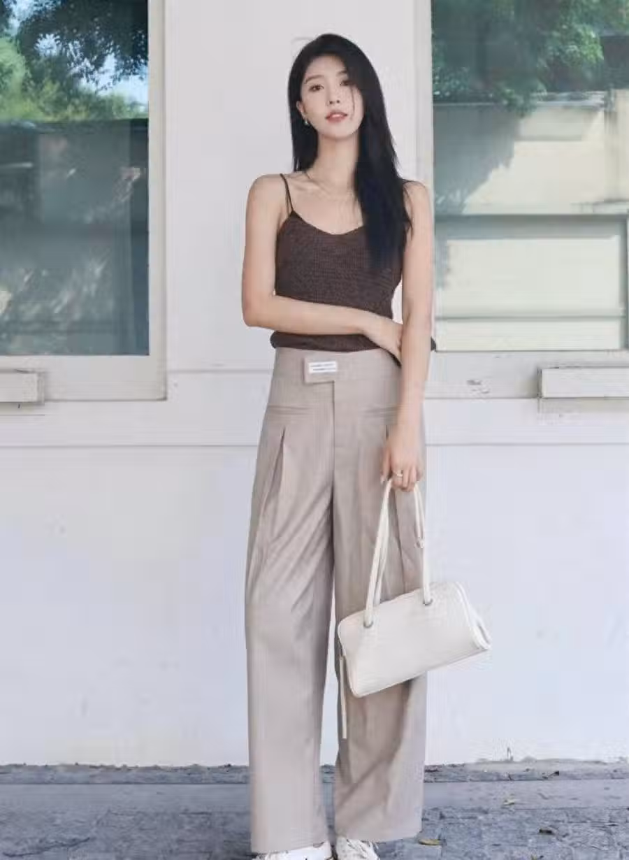 如果你的衣櫥里有一條V領款式的吊帶衫,那麼在搭配下裝的時候,盡量可以將重心放在褲裝上。作為日常生活當中出鏡率最高的褲子,搭配吊帶衫再合適不過了,尤其是V領吊帶衫,跟長褲進行組合,就不會顯得特別暴露俗氣。