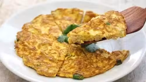 4、雞蛋打入碗里,加炒好的菜脯與蔥花攪拌好備用,平底鍋燒熱,下少量的油後倒入雞蛋,用鏟子不停地向四周把雞蛋攤成一個大圓形,煎至一面成金黃色時翻過來煎另一面成金黃色,最後折成扇形即可起鍋裝盤。