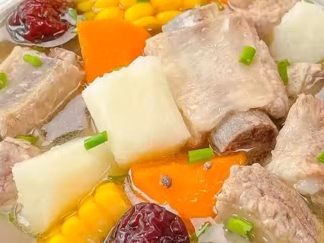 準備食材:山藥,排骨,胡蘿蔔,玉米,紅棗,蔥花,薑片。
