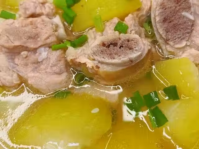 準備食材:毛瓜,排骨,薑片,蔥花。