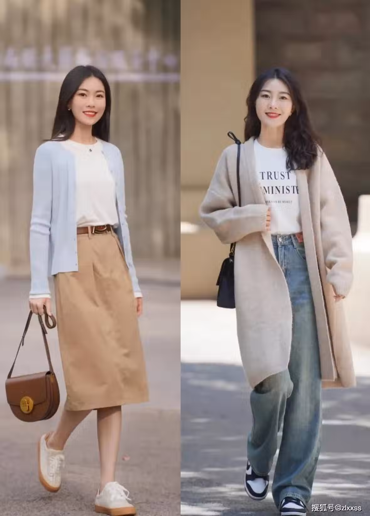 介於直曲之間的微寬松版型設計,讓穿著更加舒適、顯瘦。此時配上半身裙/褲,再用項鏈、包包等配飾點綴,是「學究風」的完美展現。