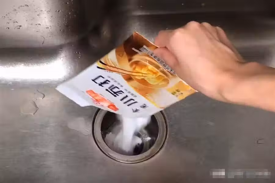 接下來我們來清潔洗碗池下水道裡面的油污和臟東西,在下水口處擠入一些洗潔精,再倒入一些小蘇打,倒入適量的白醋,小蘇打和洗潔精都有強效去污的能力,白醋能夠軟化下水道裡面的污垢。