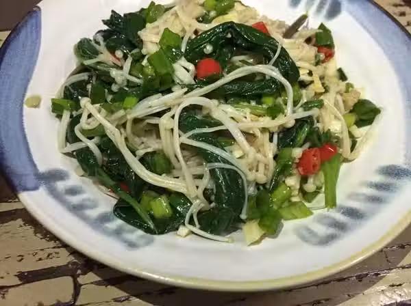 主料:金針菇200克、菠菜300克、花生仁(炒)30克、食鹽1/2茶匙、醋2湯勺、雞精少許、姜1小塊、蒜2瓣、生抽1湯勺、白糖1茶匙、芝麻油5克