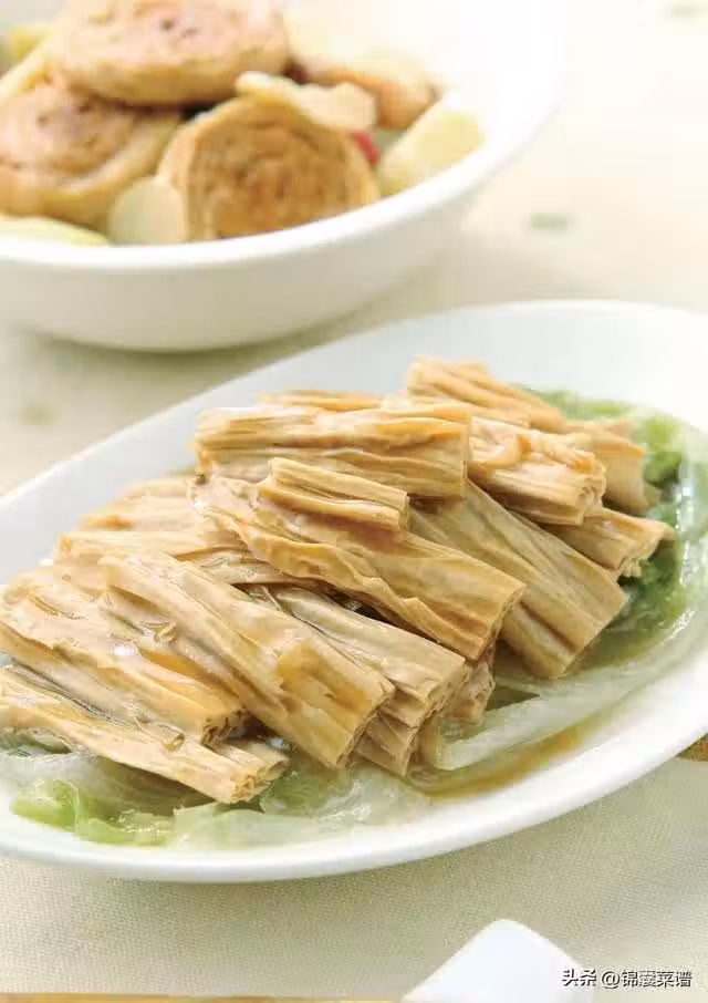 4 另熱鍋,加入 1 大匙植物油,放入生菜和少許鹽(分量外)炒熟後盛盤,再放入腐竹段即可。