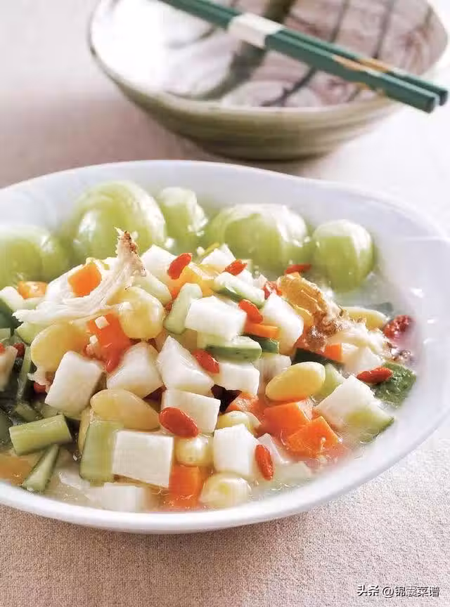 銀杏 60 克,胡蘿蔔丁 30 克,小黃瓜丁 40 克,山藥丁 40 克,薑末 10 克,上海青 4 棵,當歸 2 片,枸杞子 10 克,水 500 毫升