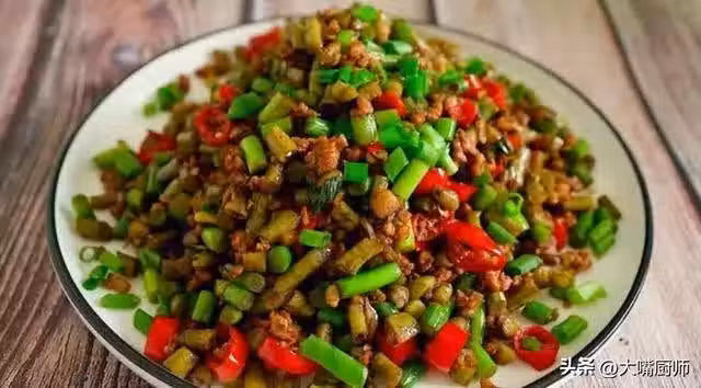 2、起鍋燒油,放入姜蒜末爆香,倒入腌好的肉末中火煸炒至變色,加入泡椒、酸豆角,大火翻炒2分鐘,加入食鹽、生抽、蚝油調味,翻炒均勻後撒上蔥花,即可出鍋。