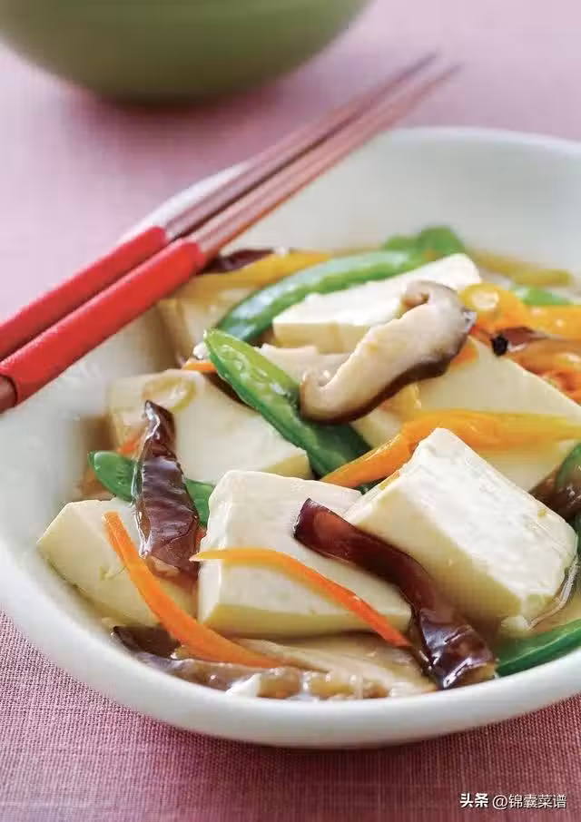 蛋豆腐 1 盒,荷蘭豆 50 克,金針筍 5 克,鮮香菇 1 朵,胡蘿蔔 10 克,黑木耳絲 20 克,薑絲 5 克,市售香菇高湯 200 毫升