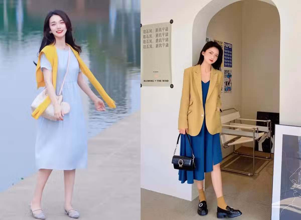 在時尚的舞台上,不僅有撞色的激情,還有風格的混搭魅力。藍色連衣裙上的不規則設計,充滿了前衛時尚感,而黃色的西裝外套則給人正式與莊重的感覺。這樣的搭配,加上一雙樂福鞋,仿佛告訴世界:風格,不受約束。▼