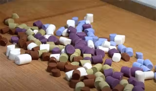 7.現在5色麵糰都和好了,把它們都揉成細長條,下大小均勻的劑子。