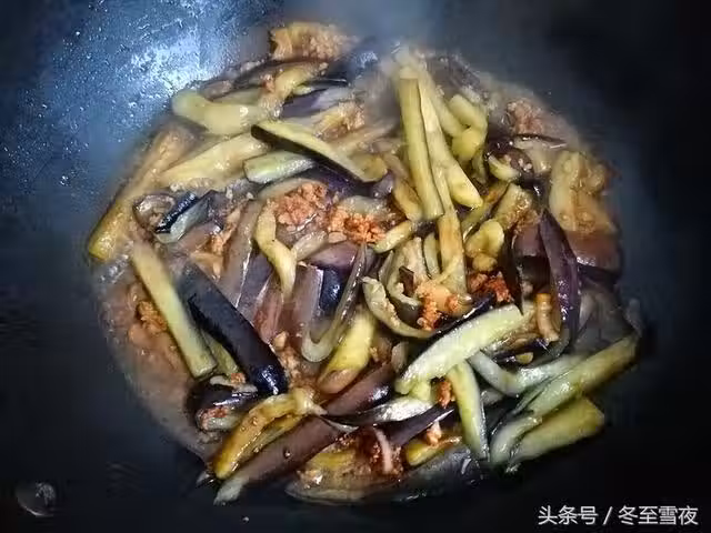 7.下入炒好的茄條。翻炒均勻,加入少許鹽,淋入半碗水,燒開,中火燒制入味