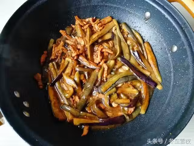 8.下入茄條翻炒均勻,加入半碗水,再加入少許鹽,鹽要少放或者不放,腌制時已經加鹽了,大火燒開,轉中小火燒制入味